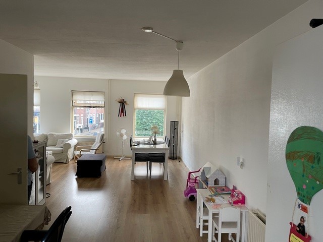 Ruime woonkamer voorzien van laminaatvloer, nette open keuken, toilet, ruime badkamer met douche.