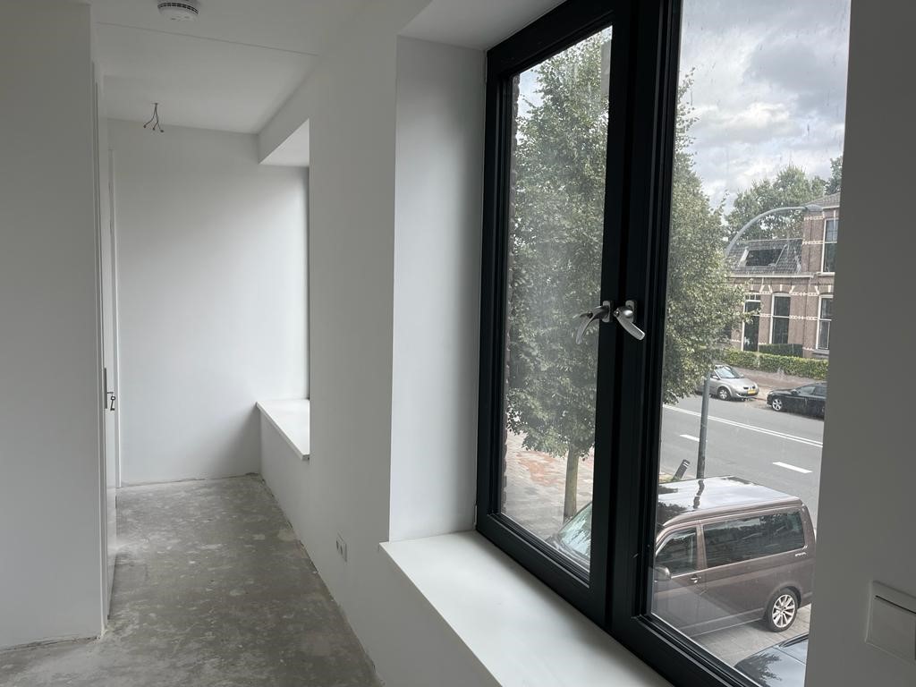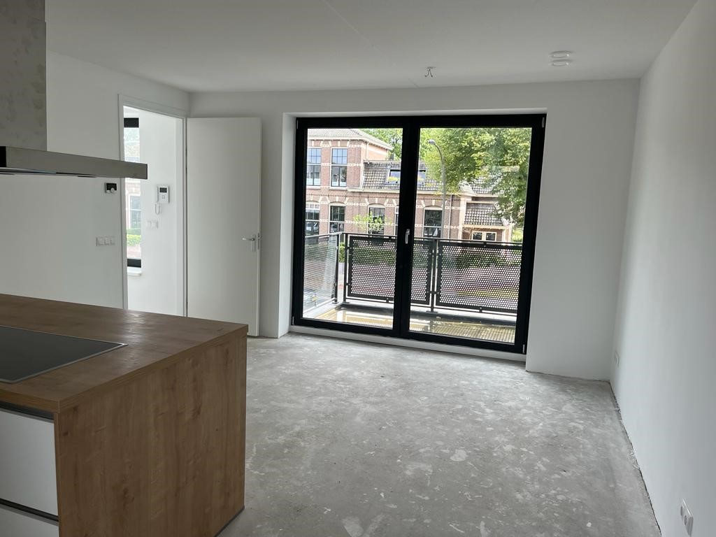 -Moderne woonkamer met open keuken schuifpui naar balkon met fraai zicht, een open moderne inbouwkeuken