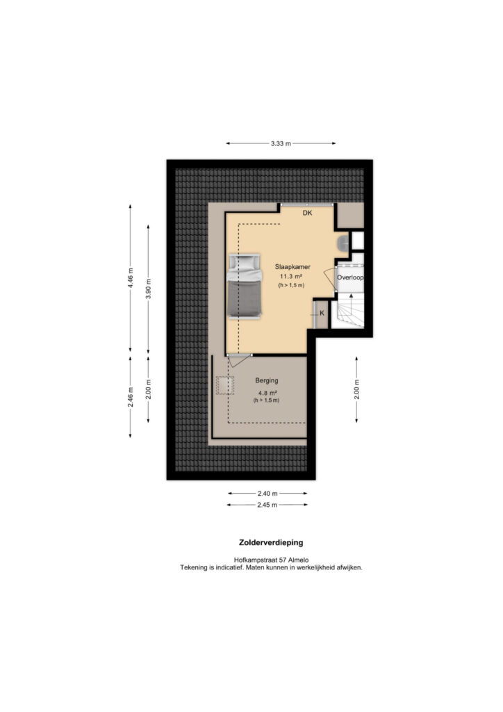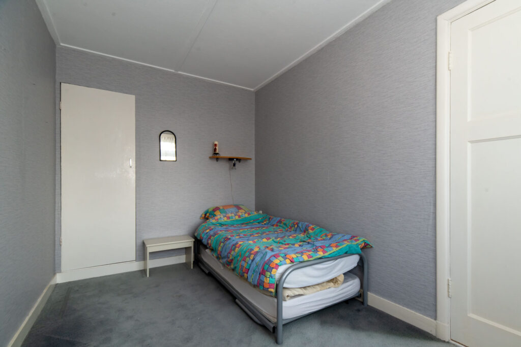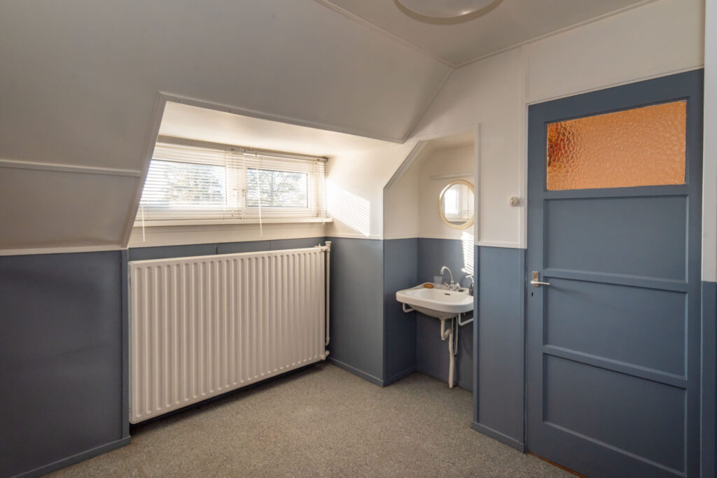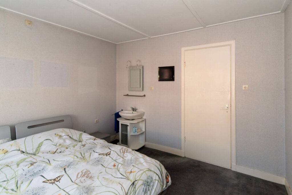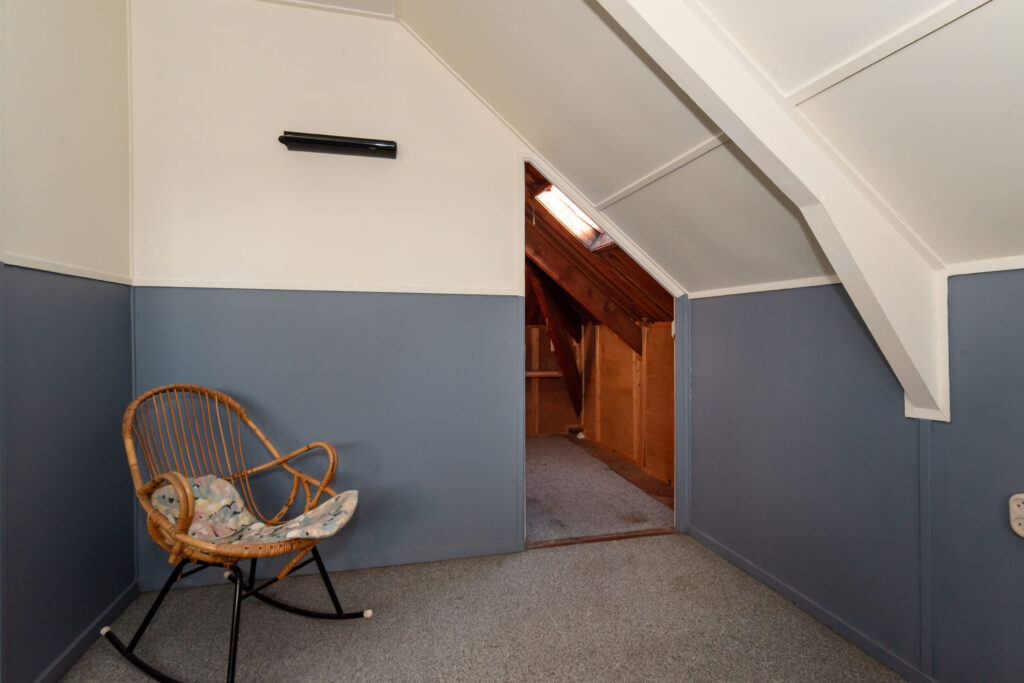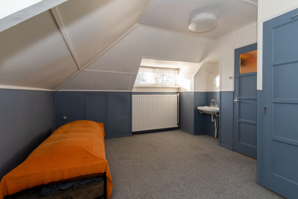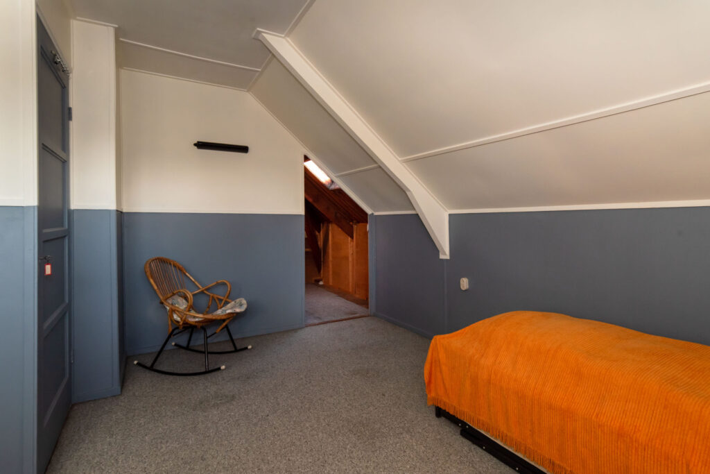Ruime slaapkamer met dakkapel, wastafel en inbouwkast. Daarnaast is er toegang tot de bergzolder.
