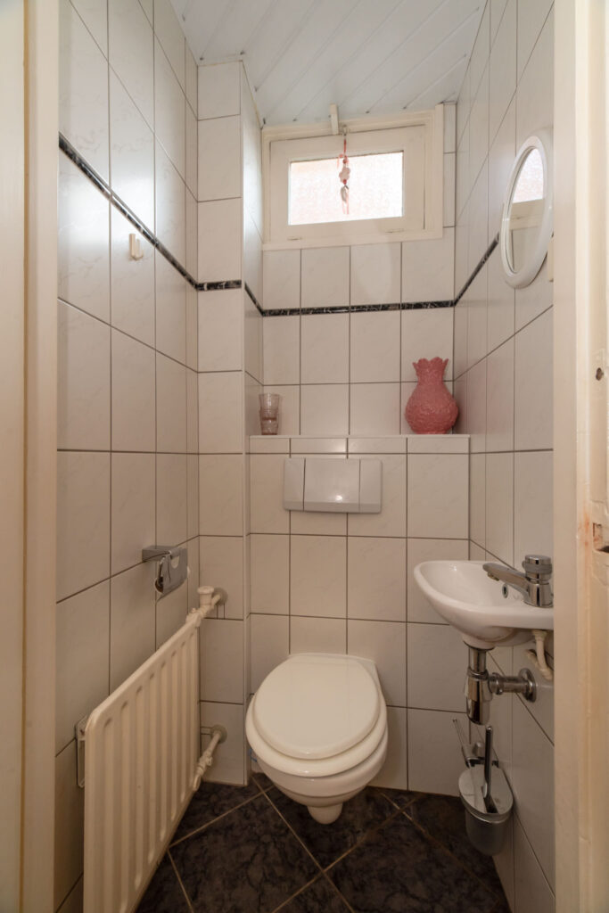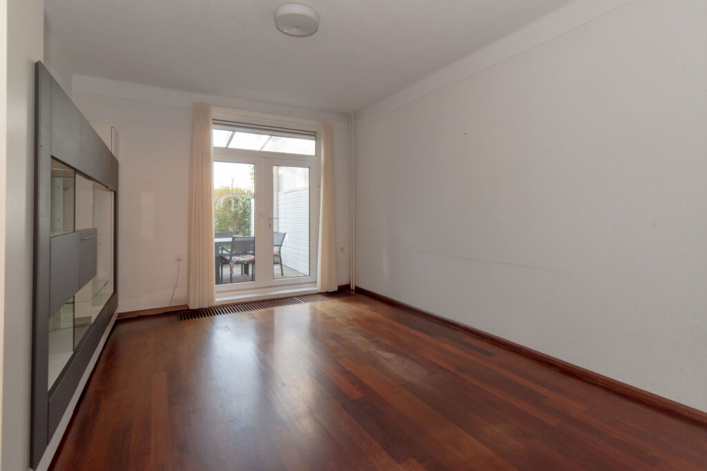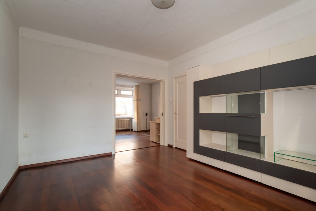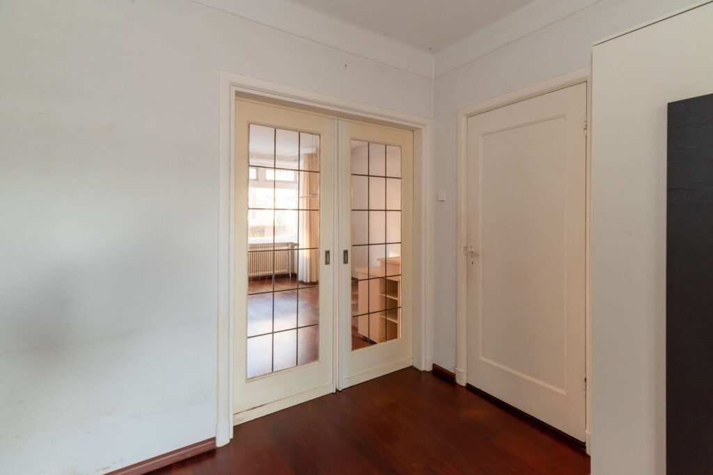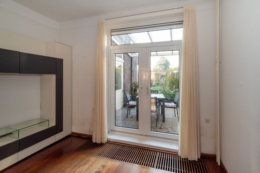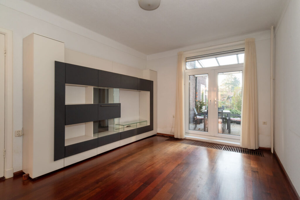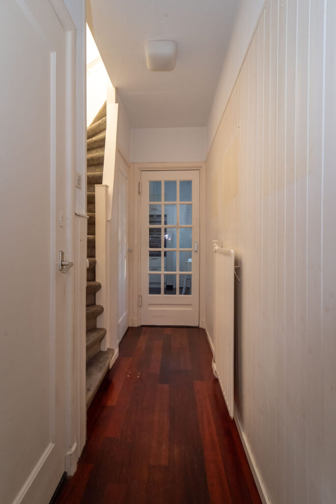 Entree, hal met trapopgang en toilet. Vanuit de hal heeft u toegang tot de kelder, de keuken en de woonkamer. De woonkamer is voorzien van een fraaie erker aan de straatzijde, wat zorgt voor een mooie lichtinval, en beschikt over een massieve parketvloer en suite deuren. Aansluitend bevindt zich de eetkamer met volop ruimte voor een grote eettafel. Via openslaande deuren bereikt u de prachtig diepe tuin.