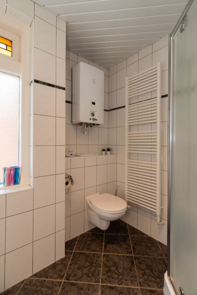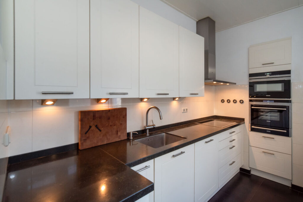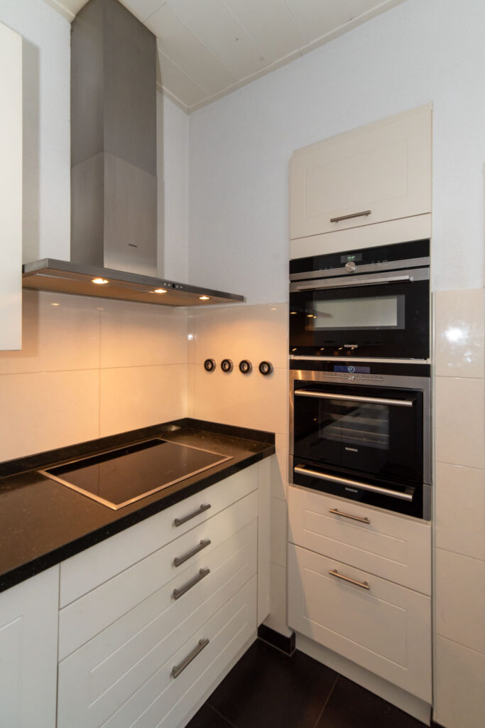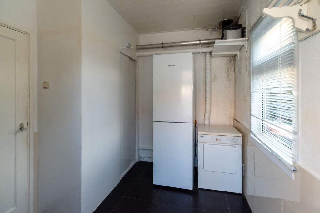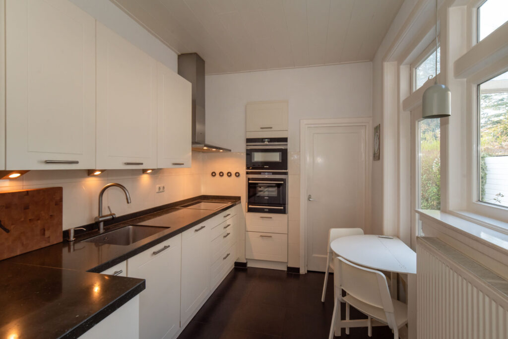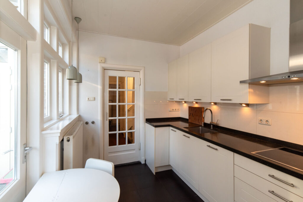 De lichte keuken is aan de achterzijde van de woning gelegen, van alle gemakken voorzien, biedt uitzicht op het terras en geeft toegang tot de bijkeuken met aansluiting voor de wasmachine.