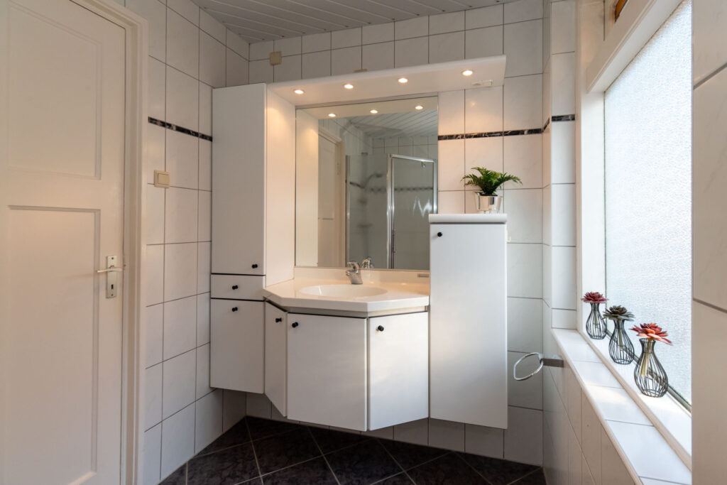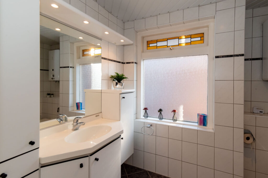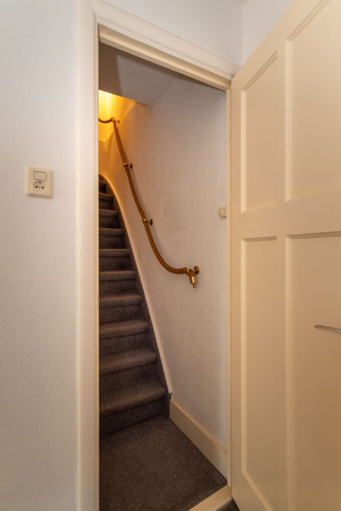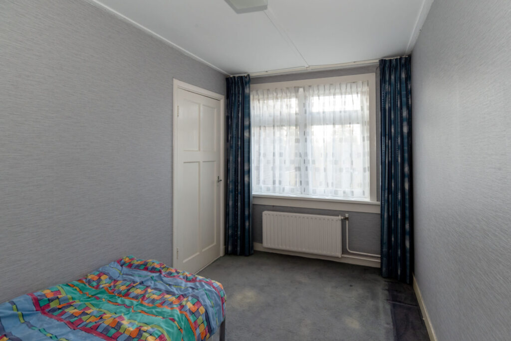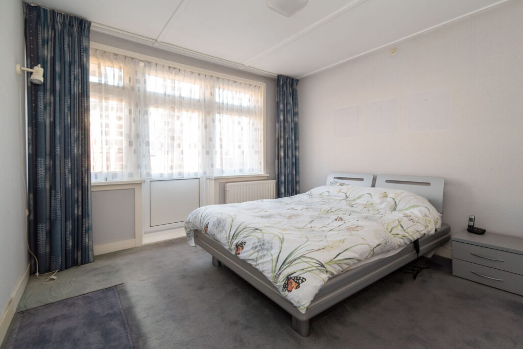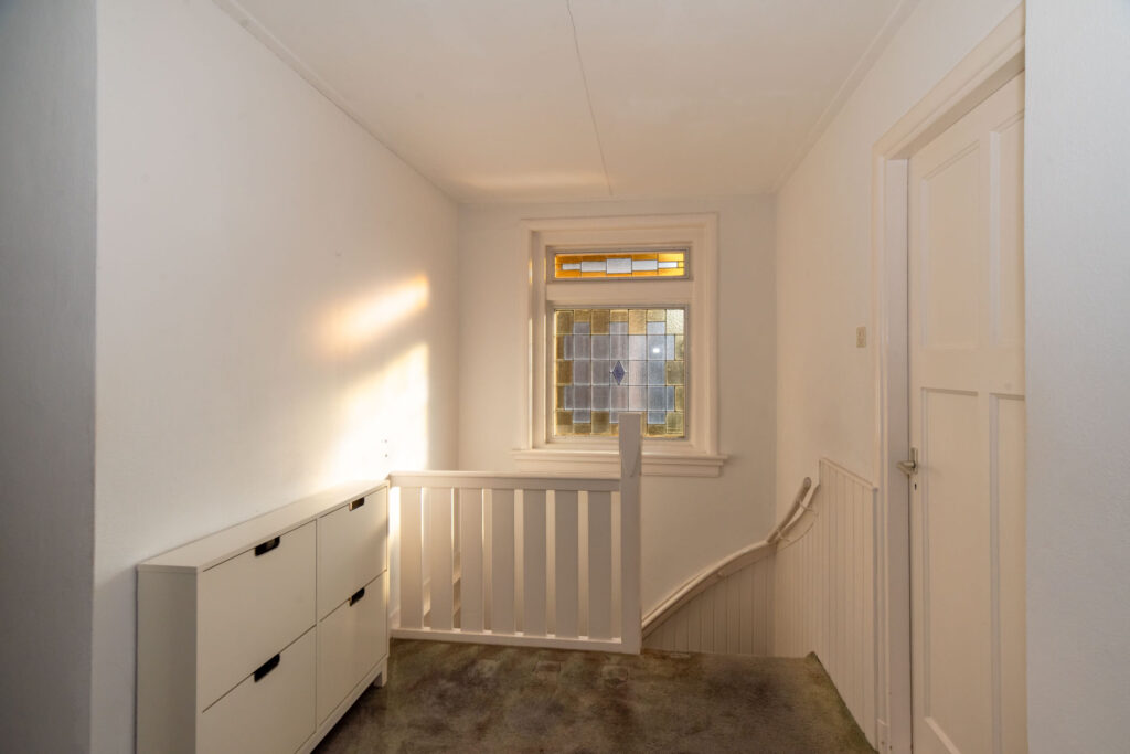 Overloop met toegang tot drie slaapkamers en de badkamer. De ruime slaapkamer aan de voorzijde beschikt over een eigen wastafel en een deur naar het balkon. De tweede slaapkamer is voorzien van een praktische inbouwkast. De derde slaapkamer biedt toegang tot het dakterras aan de achterzijde. Vanuit de hal bereikt u via een vaste trap de tweede verdieping met de vierde slaapkamer.