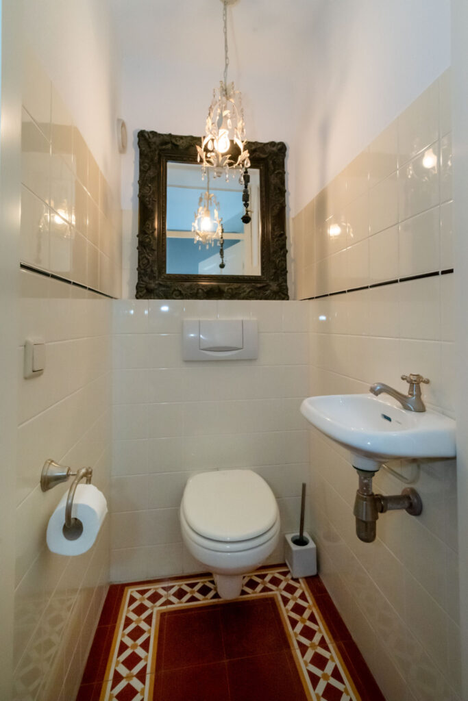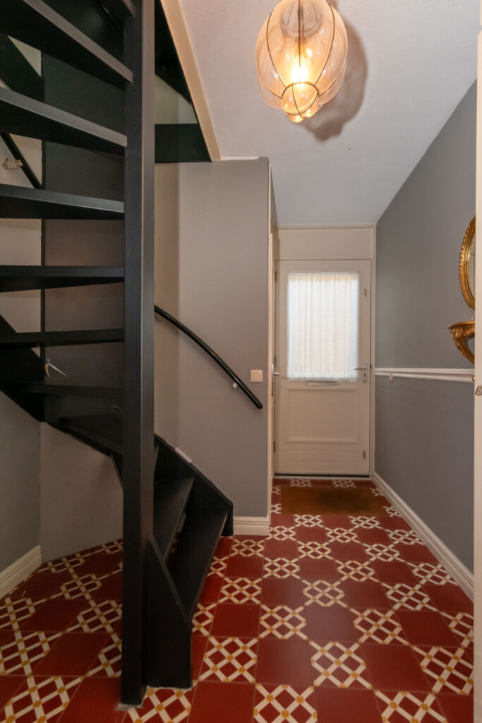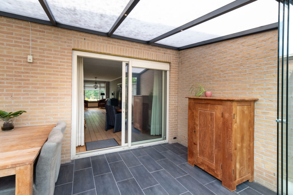 Entree/hal met trapopgang en toilet met wandcloset en fonteintje. De lichte L-vormige woonkamer is voorzien van een sfeervolle erker en schuifpui naar de fraaie serre, zonneterras en ruime tuin.