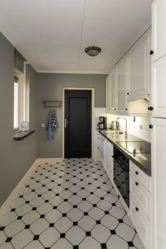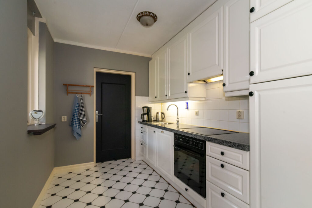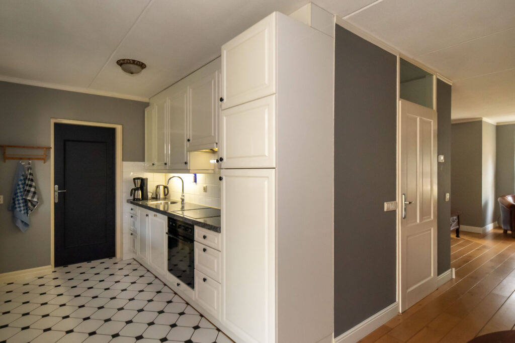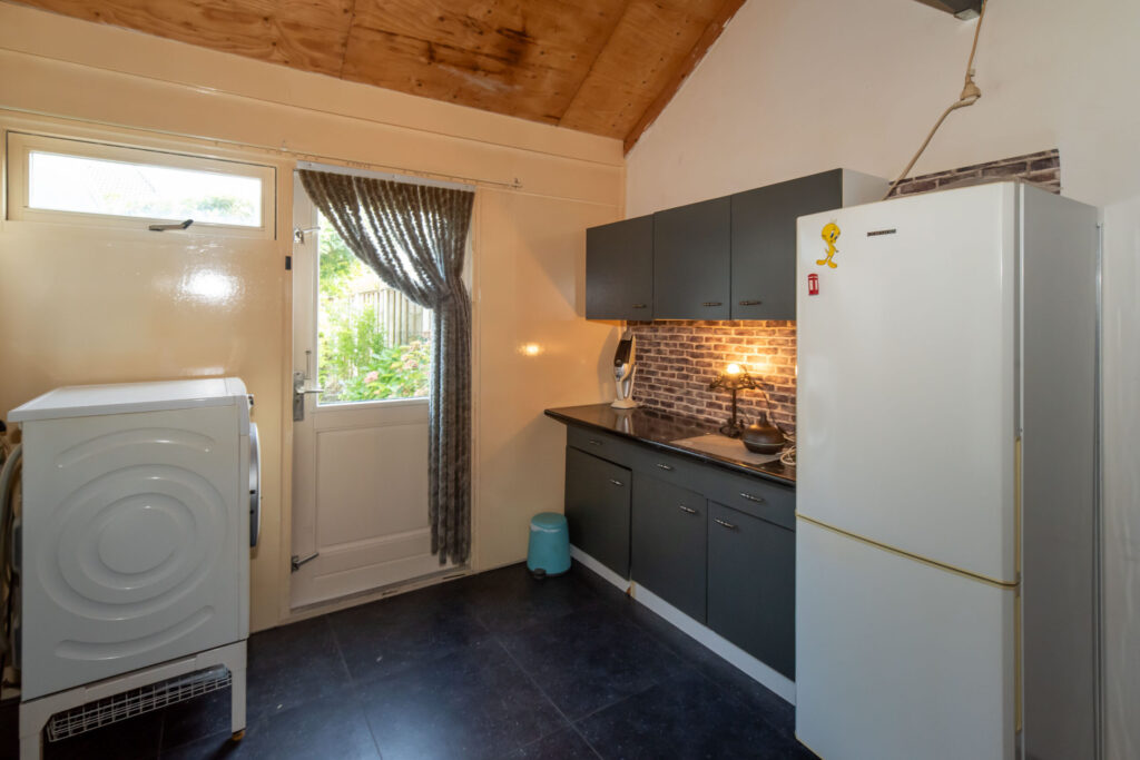 De halfopen keuken is uitgevoerd met een natuurstenen werkblad en diverse inbouwapparatuur. Vanuit de keuken is de aangebouwde berging/bijkeuken bereikbaar, waar zich ook de C.V. -installatie en wasmachineaansluiting bevindt.