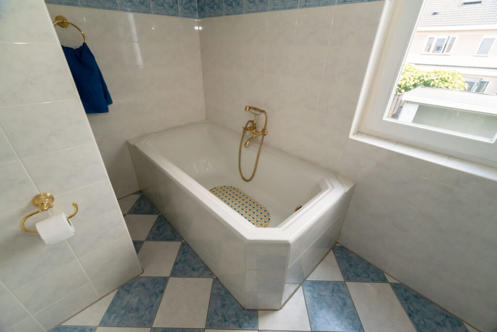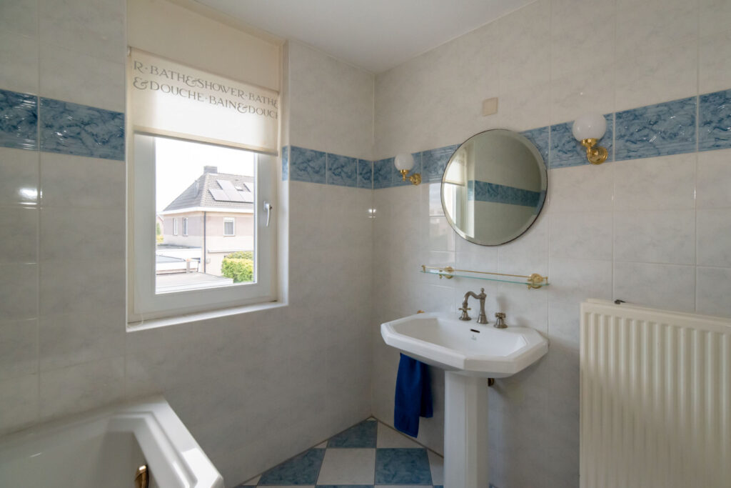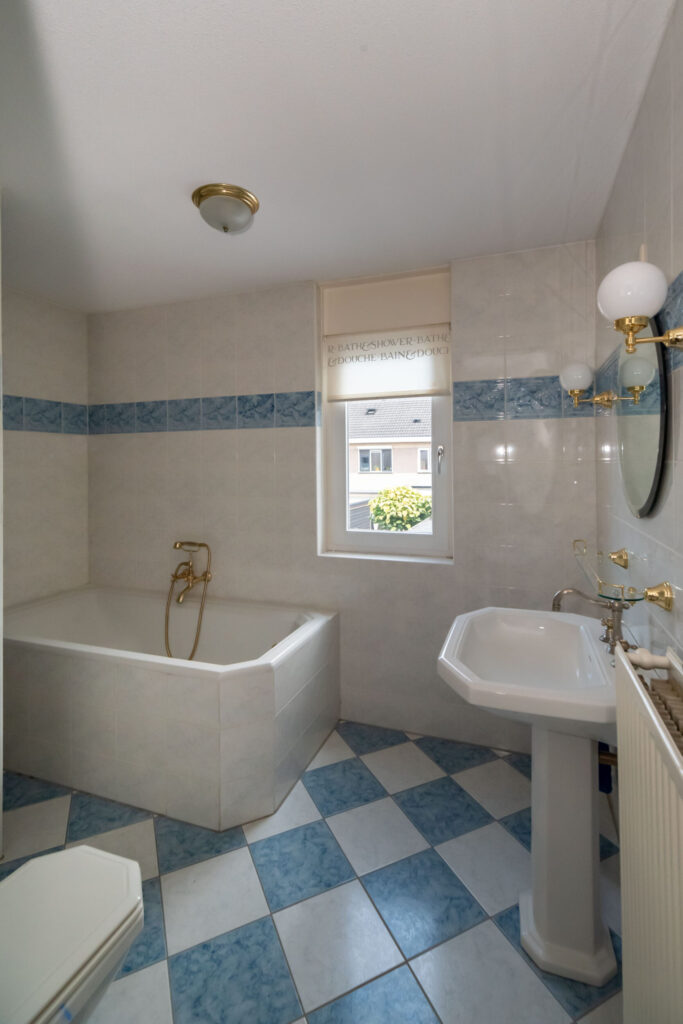 Overloop met toegang tot drie slaapkamers, waarvan één met deur naar het balkon aan de voorzijde. Hier geniet je volop van het vrije uitzicht over de vijver. De volledig betegelde badkamer is royaal en voorzien van een ligbad, douche, tweede toilet en wastafelmeubel.