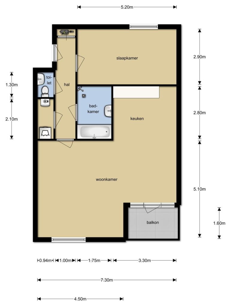Entree, hal met meterkast, toegang tot het toilet en de badkamer, één royale slaapkamer, open keuken en de woonkamer met voorgelegen balkon.